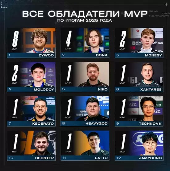 此外,molodoy与m0NESY各收获2枚MVP,并列第三梯队。包括KSCERATO、NiKo、Techno等在内的8位选手仅有1枚入账,中国选手JamYoung同样榜上有名。