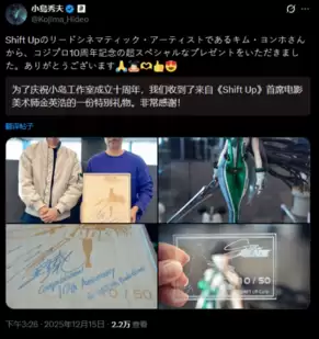 最近,知名游戏制作人小岛秀夫在他的社媒账号上分享了一份特别的十周年礼物——一块由《剑星》开发商 Shift Up 首席电影演出美术金亨泰精心定制的专属伊芙手办,再次展现了游戏与厂商之间的惺惺相惜与行业情谊。