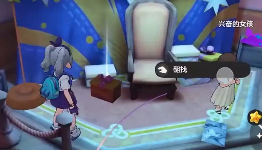 通过这一关后,需要注意一个很重要的收集点,就在地图上有椅子的位置。点击那里进行翻找,会获得道具“眠晓之星”。这个道具在后续的游戏进程中会用到,所以千万不能漏掉。拿到道具后继续往地图深处走,会遇到一位富有的夫人。和她对话完成互动,然后根据任务提示去操作吧台的桌子,将桌子挪动一下。接着又要去找另一位名叫发愁的夫人,和她对话之后继续按照指引做下去。