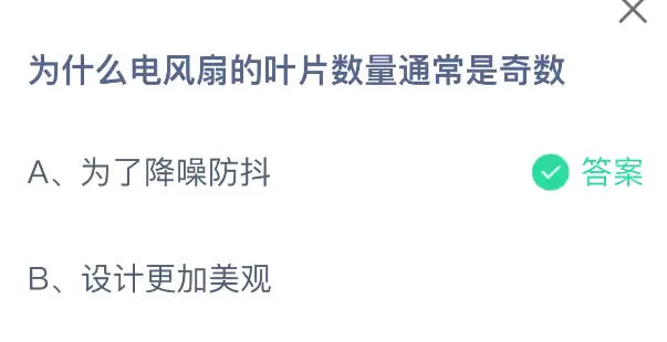 您是否曾好奇,为什么电风扇的叶片数量大多是奇数呢?支付宝的小鸡课堂开课啦!每天只需花一分钟参与答题,赚些饲料喂养小鸡,就能轻松做公益献爱心,既有意义又充满乐趣!2025年12月17日,蚂蚁庄园的今日课堂题目正确答案是【为了降噪防抖】,这正是因为风扇叶片设计为奇数可以排列成不对称的形状,能有效降低噪音和减少自身振动。
