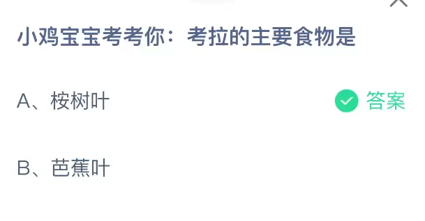 小鸡宝宝考考你:考拉的主要食物是什么?支付宝小鸡课堂开课啦!每天花一分钟答题赚饲料,喂喂小鸡就能贡献爱心啦!轻松又意义十足!2025年12月17日蚂蚁庄园的小鸡课堂题目正确答案是【桉树叶】,考拉的主要食物是桉树叶。桉树叶含有考拉所需的营养和水分,其消化系统已经适应分解树叶中的毒素。