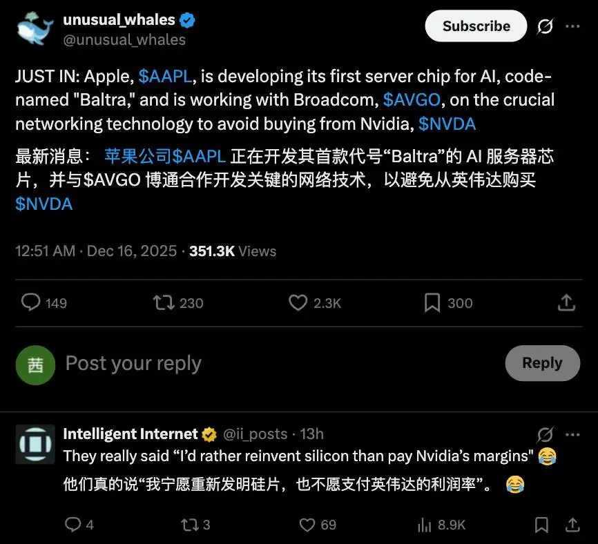 该账号在发文中特别强调,苹果“宁愿重新设计自己的芯片架构,也不愿为英伟达的高额利润单买单”。外媒WccfTech分析认为,苹果研发Baltra芯片正是为了满足其日益增长的AI推理需求,该芯片预计将于2027年正式亮相。