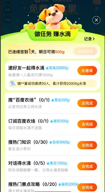 用户还可以通过完成各类活动任务获得水滴。百度农场的任务奖励体系涵盖了日常任务、社交裂变以及限时活动三大机制,具体以实际页面展示为准;