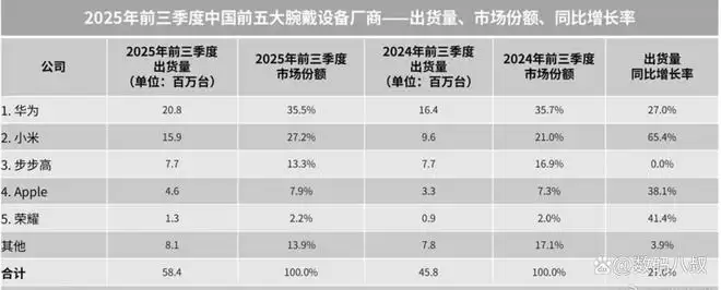 国际数据公司(IDC)近期发布的数据表明,2025年前三季度全球智能穿戴设备出货量达到1.5亿台,同比增长10.0%。其中,中国市场累计出货量达5,843万台,更实现了27.6%的同比强劲增长。