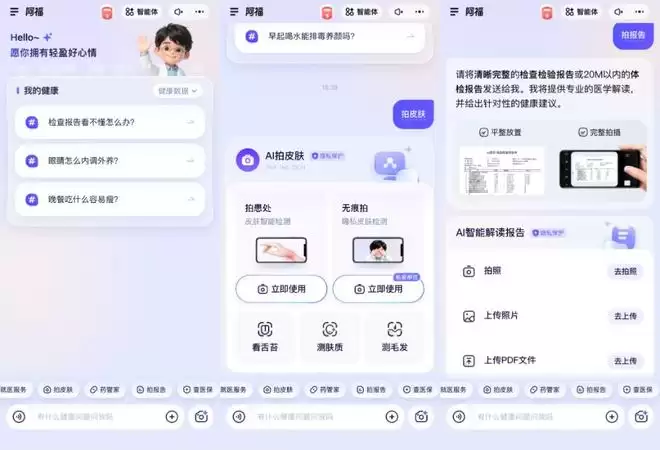 这款产品一经发布,便以“AI健康问答”为起点,通过文字、语音、图像三种形式,让用户可以拍皮肤、拍药盒、拍体检报告来提问。