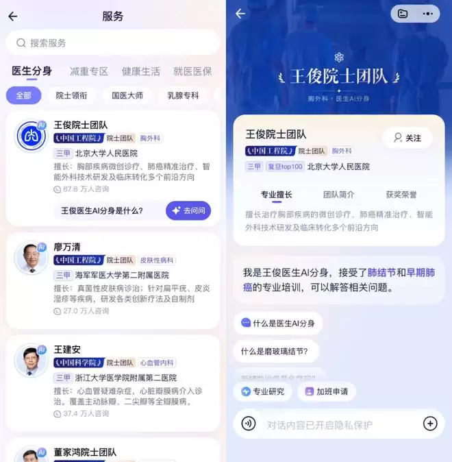 数据显示,目前已有30万名医生、5000多家医院接入平台,六位国家院士与500多位名医在App中开设“AI分身”,为用户提供健康科普型咨询服务。
