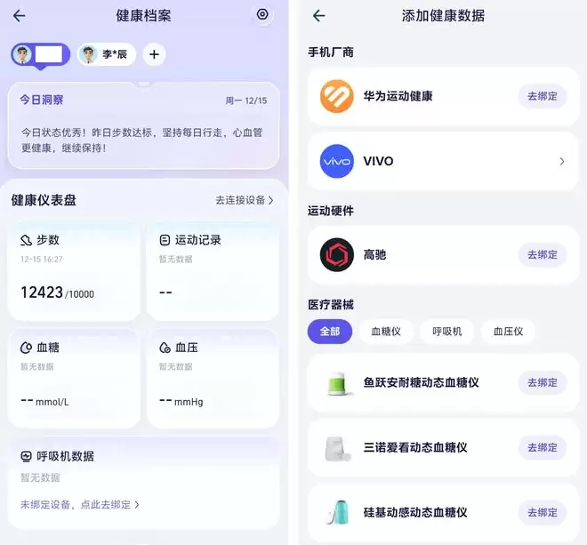 现在,阿福支持连接华为、苹果、欧姆龙等主流品牌的智能设备,步数、睡眠时间、血压这些数据都会自动同步。这样一来,AI 对你的身体状况就有了更全面的了解,给出的建议也不会是通用的「多喝热水」。