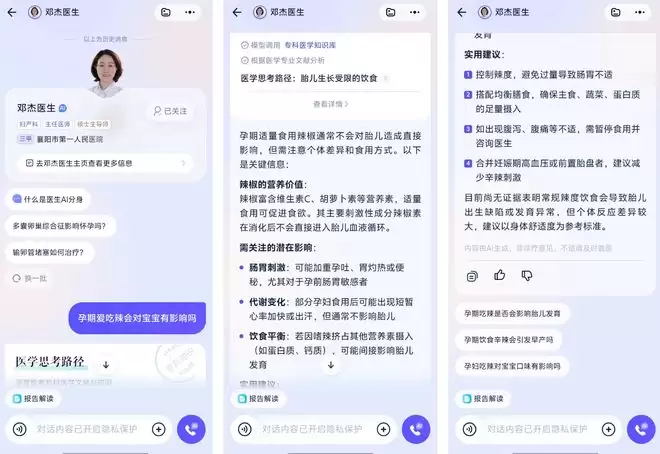 我关注了邓杰医生,并询问:「孕期爱吃辣会对宝宝有危害吗?」,这个 AI 分身解释了辛辣食物对孕妇的影响机制,并贴心地提醒了注意事项。