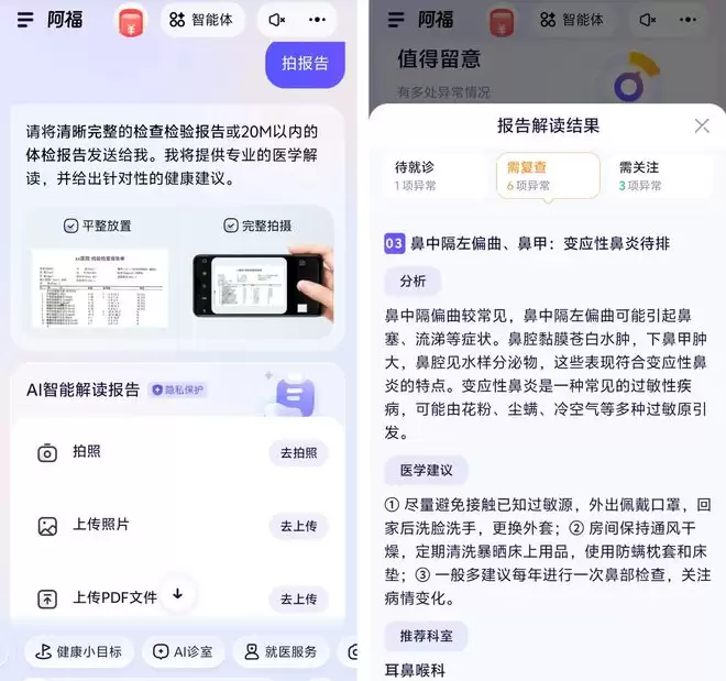 阿福这种随时可问、专业靠谱、还不用排队的健康 AI,正好卡在了这个需求点上,不仅能够及时地提供帮助和安慰,还解决了普通人日常那些不值当跑医院但又真实存在的健康困惑。