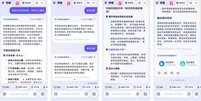 比如我说「胃胀」,它会进一步追问症状出现的时间和进展,接着给出建议和原因分析。要知道,通用 AI 往往一问一答就结束了,而阿福的问诊方式更接近真人健康顾问。