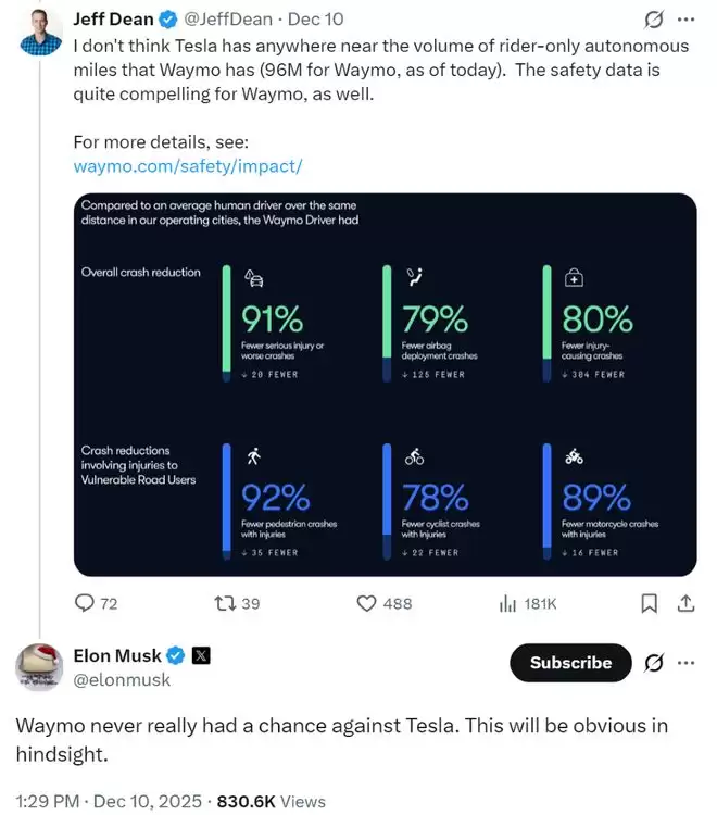 这这一表态迅速引发谷歌DeepMind首席科学家杰夫·迪恩的回应,迪恩在社交媒体上指出,特斯拉在”仅有乘客的自动驾驶里程”方面远不及Waymo的9600万英里(约合1.54亿公里)。