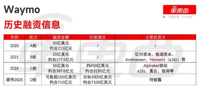 2024年,Waymo完成C轮融资,金额达56亿美元(约合人民币397.6亿元),投后估值约450亿美元(约合人民币3195亿元),此次融资由Alphabet领投,外部投资者包括a16z、富达、银湖和T. Rowe Price等。