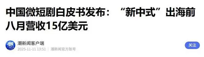 潮新闻客户端 2025-11-11 中国微短剧白皮书发布:“新中式”出海前八月营收15亿美元