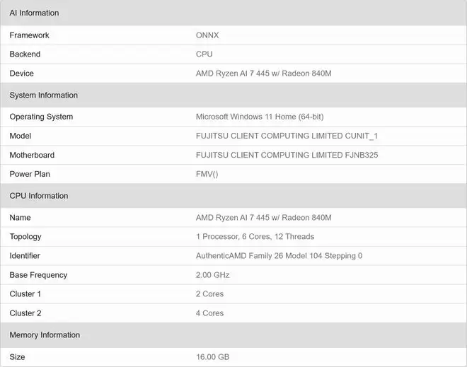 系统信息显示,本次测试平台隶属于富士通客户端计算株式会社。这颗处理器采用了2个性能核心与4个能效核心组成的混合双簇架构,总计6个核心;GPU部分则为配备4个计算单元的Radeon 840M集显。作为参考,本代的锐龙AI 5 340采用了“3个Zen 5核心 + 3个Zen 5c核心”的处理器架构配置。