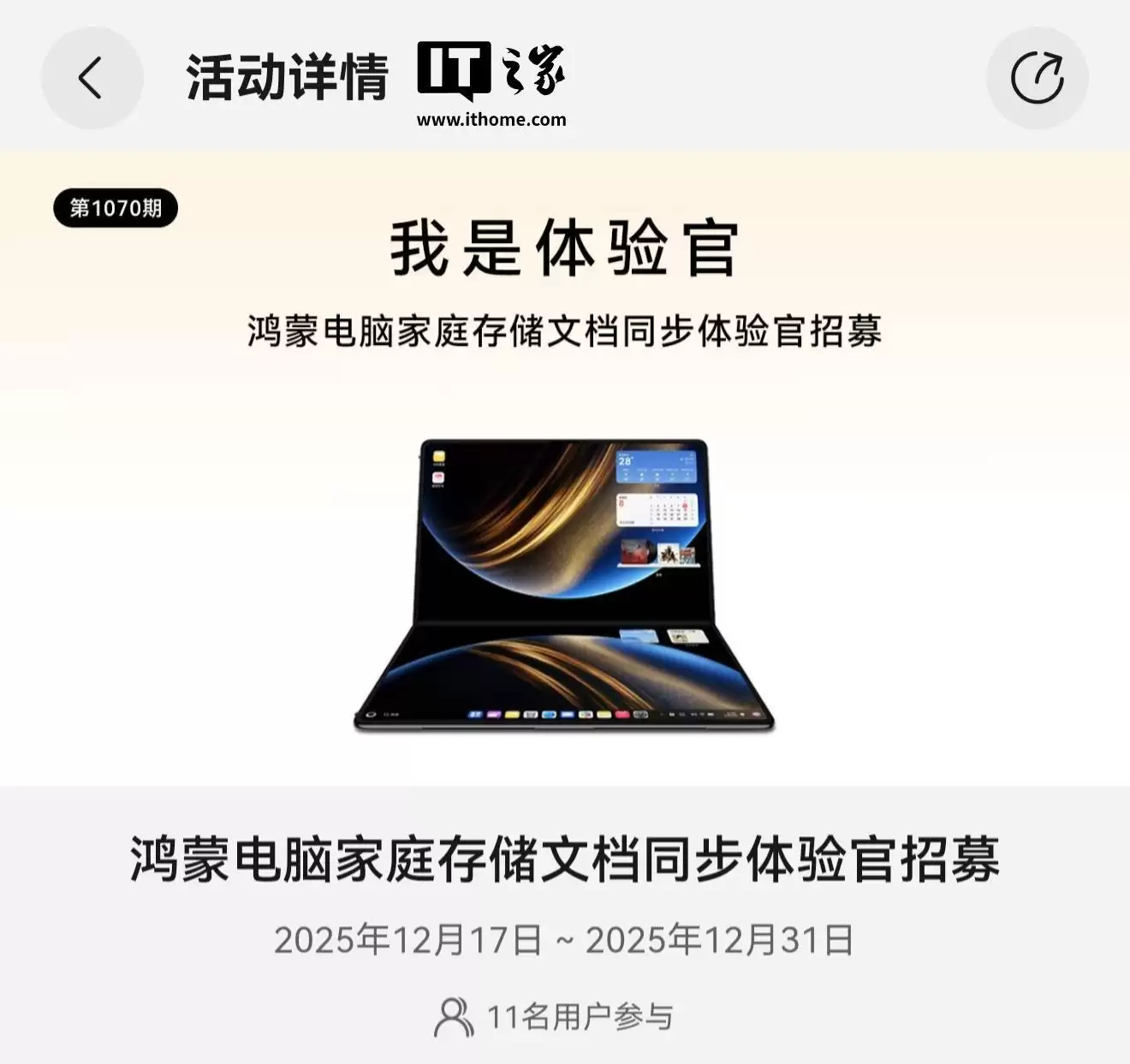 IT之家12月17日消息,我的华为App活动页面显示,华为鸿蒙电脑家庭存储文档同步体验官招募活动现已启动(2025年12月17日~2025年12月31日)。