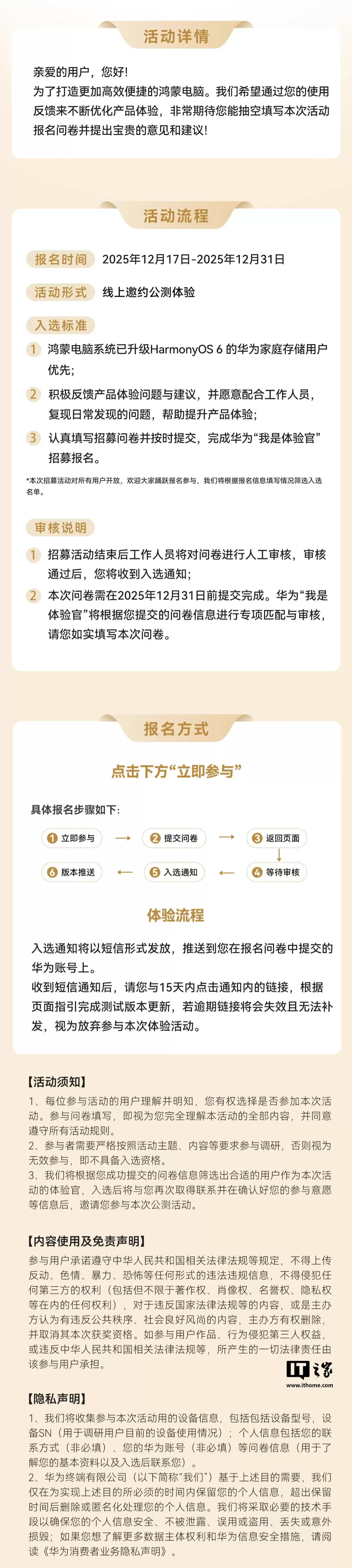 IT之家梳理本次活动重点内容如下(活动路径:我的华为-首页-活动-体验官-鸿蒙电脑家庭存储文档同步体验官招募):