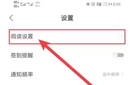 进入设置主页面后,向下滑动,找到【阅读设置】选项并点击进去,操作位置如下图标注所示。