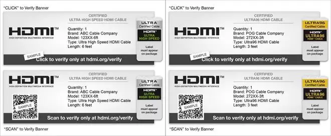 Ultra96 HDMI 线缆(96Gbps,HDMI 2.2 引入)的早期原型;Ultra High Speed HDMI 线缆(48Gbps,HDMI 2.1 引入);Premium High Speed HDMI 线缆(18Gbps,HDMI 2.0 引入)。