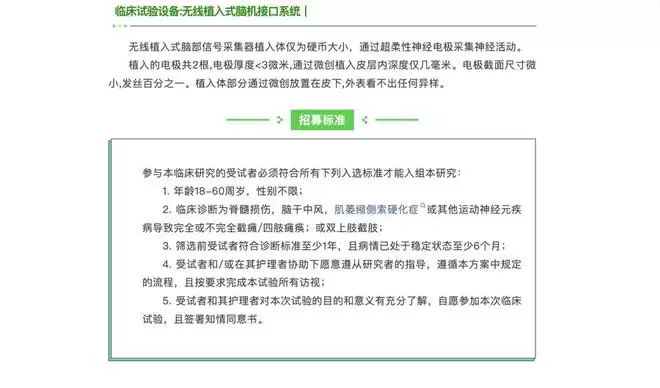 赵郑拓发给记者一份“临床试验患者招募”公告,显示正在招募因高位颈髓损伤、脑干中风、渐冻症等导致四肢瘫痪,或双上肢截肢患者。“我们已经收集到了七八百人的申请,会经过非常严格和谨慎的筛选,挑选临床试验患者。”赵郑拓表示。