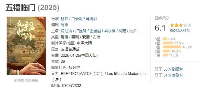由王星越、卢昱晓等人主演的《五福临门》是一部古装婚恋群像喜剧,主要讲述了郦家五姐妹在汴京寻觅良缘的故事 。