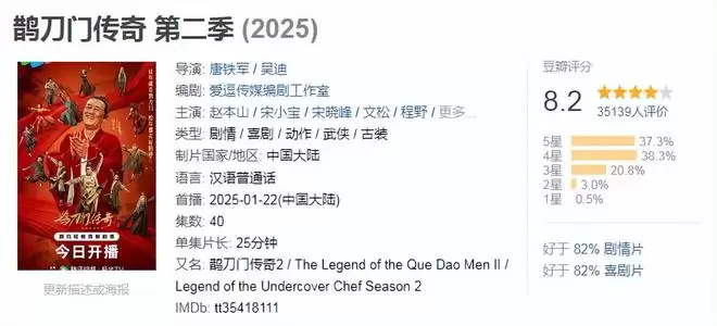 最近这两年的所有国产喜剧影视剧中,能够真正全程逗人大笑的,可能也只有《鹊刀门传奇》了,虽然第二部的热度不如第一部高,但笑点却一点都不比第一部少,如果这部剧不是在新片扎堆的贺岁档播出,可能评分会更高一些。
