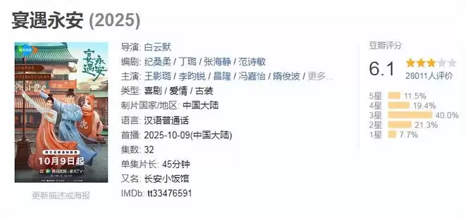 这部剧豆瓣评分4.2分,虽然分数非常低,但是由于现在拍摄喜剧的人太少了,所以在2025年喜剧电视剧里面,还是能够排到第十位。