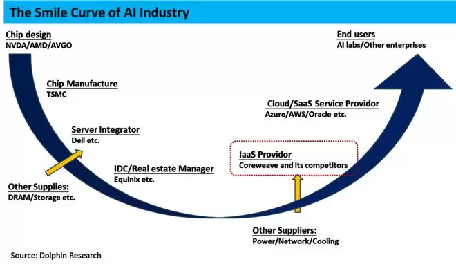 而CoreWeave目前处于产业链中相对中间的“低价值”位置,向上需要依赖多层级的供应商,向下目前也主要是作为三大头部云厂商的供应商,而不太直接接触分散的终端客户。