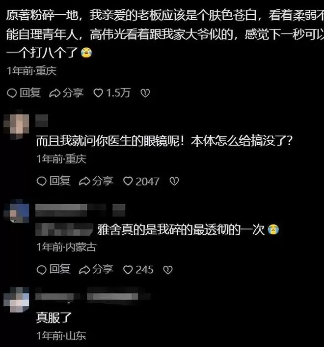 网友的评价也很一针见血:“原著老板感觉关门后弱到要喝中药,高伟光感觉关门后还要撸两个小时铁。”