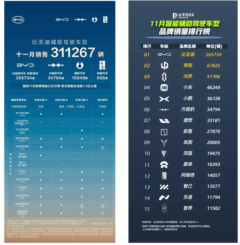 比亚迪近期公布了搭载“天神之眼”智能驾驶系统的车型销售数据,再次以亮眼的成绩领跑市场。数据显示,11月全月销量突破31万辆,达到311,267辆,延续了其在智能驾驶领域的领先优势。其中,王朝与海洋系列贡献了265,734辆,而方程豹、腾势、仰望等高端及个性化品牌也表现出色,共同构成了比亚迪在智能驾驶领域多元化产品矩阵。