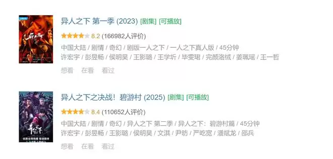 2024年的《司藤》、2024年的《西出玉门》以及《异人之下》系列热度都很不错,尤其是《异人之下》几乎成了当下奇幻剧标杆,两季豆瓣评分都8+以上,非常难得。