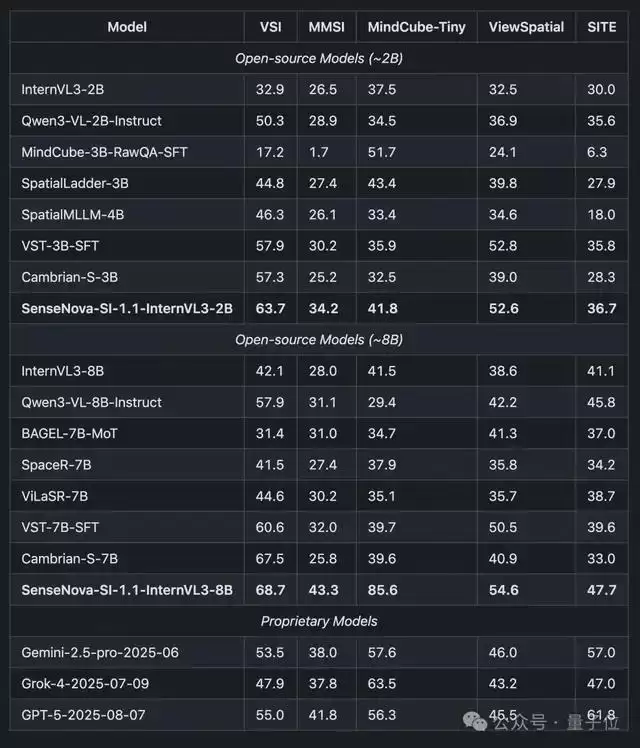 而且从具体的数据来看,不论是开源或闭源,不论是2B或8B大小,SenseNova-SI在各大空间智能基准测试中都拿下了SOTA的成绩: