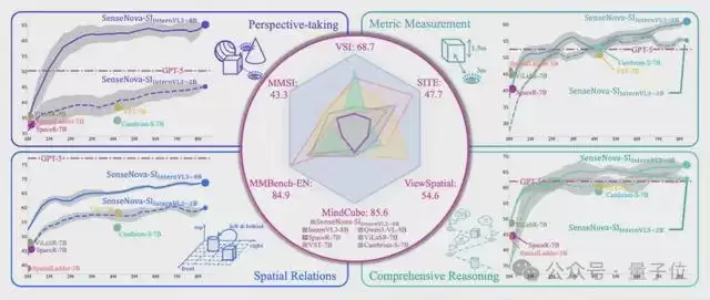 例如SenseNova-SI仅用了同类模型10%的训练数据,就达到了SOTA水平。而且,它不再是靠死记硬背,而是真正理解了三维空间关系。