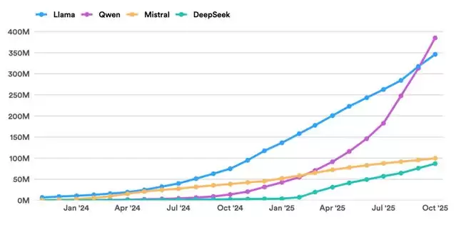 根据 Hugging Face 平台的下载统计,阿里巴巴旗下的 Qwen(通义千问)模型系列在 2025 年 9 月正式超越 Meta 的 Llama,成为该平台下载量最高的大语言模型家族。截至 12 月中旬,Qwen 累计下载量已达约 3.85 亿次,而 Llama 约为 3.46 亿次。另一组数据同样值得关注:2024 年 8 月至 2025 年 8 月间,中国开发者的模型下载量占 Hugging Face 总下载量的 17.1%,首次超过美国的 15.8%。这组数据由麻省理工学院与 Hugging Face 联合追踪,经 ATOM 项目分析后公布。