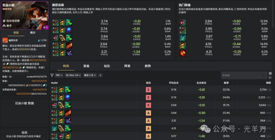 我们首推“船长的酿造成品”、“幸运达布隆金币”和“朔极之矛”作为厄运小姐的核心三件套。在当前版本,最受玩家青睐的出装方案包括大副的燃发枪、无尽之刃,以及朔极之矛。