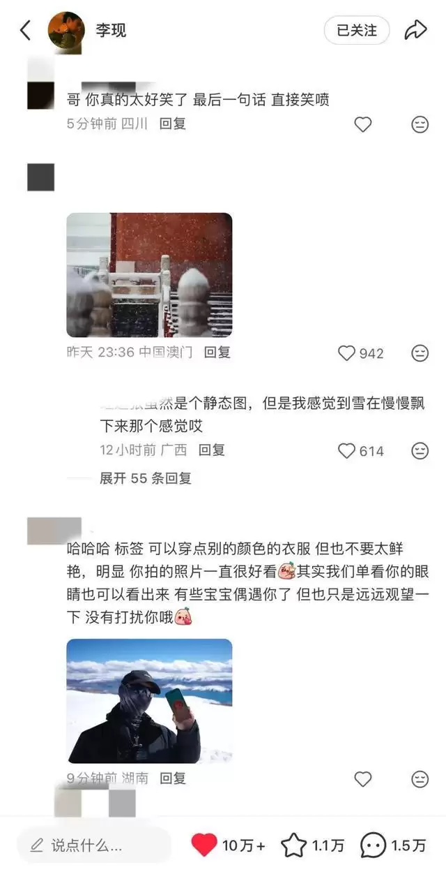 事情源于12月14日深夜李现在社交平台发布的一则内容。他不仅晒出前一天被网友在故宫偶遇拍摄的雪景图,还表示“以后不穿一身黑了,已经成我扫街拍摄的标签了,我得研究研究新的伪装技术”。