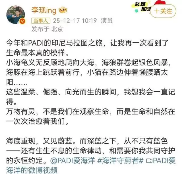 12月17日,李现在个人社交平台晒出一段于印尼马腊图潜水的视频。在画面中,收录了他与鲨鱼近距离邂逅的震撼一幕。