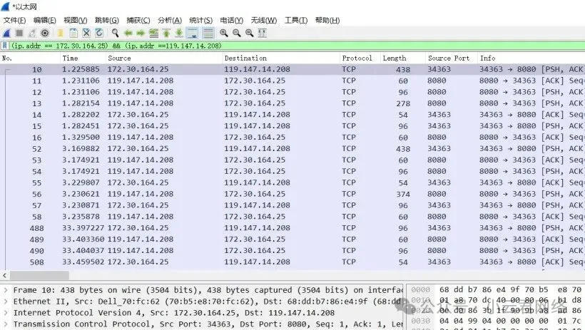 源IP过滤:使用 `ip.src == 目标IP` 来定位特定主机发送的网络流量,比如用于排查恶意程序的网络通信。目标IP过滤:使用 `ip.dst == 目标IP` 来查看发往特定主机的入站流量,比如确认服务器是否收到了客户端的请求。双向流量过滤:使用 `ip.addr == 目标IP`,可以同时显示指定IP地址的所有进、出站数据包,这对于排查网络连通性问题特别有用。