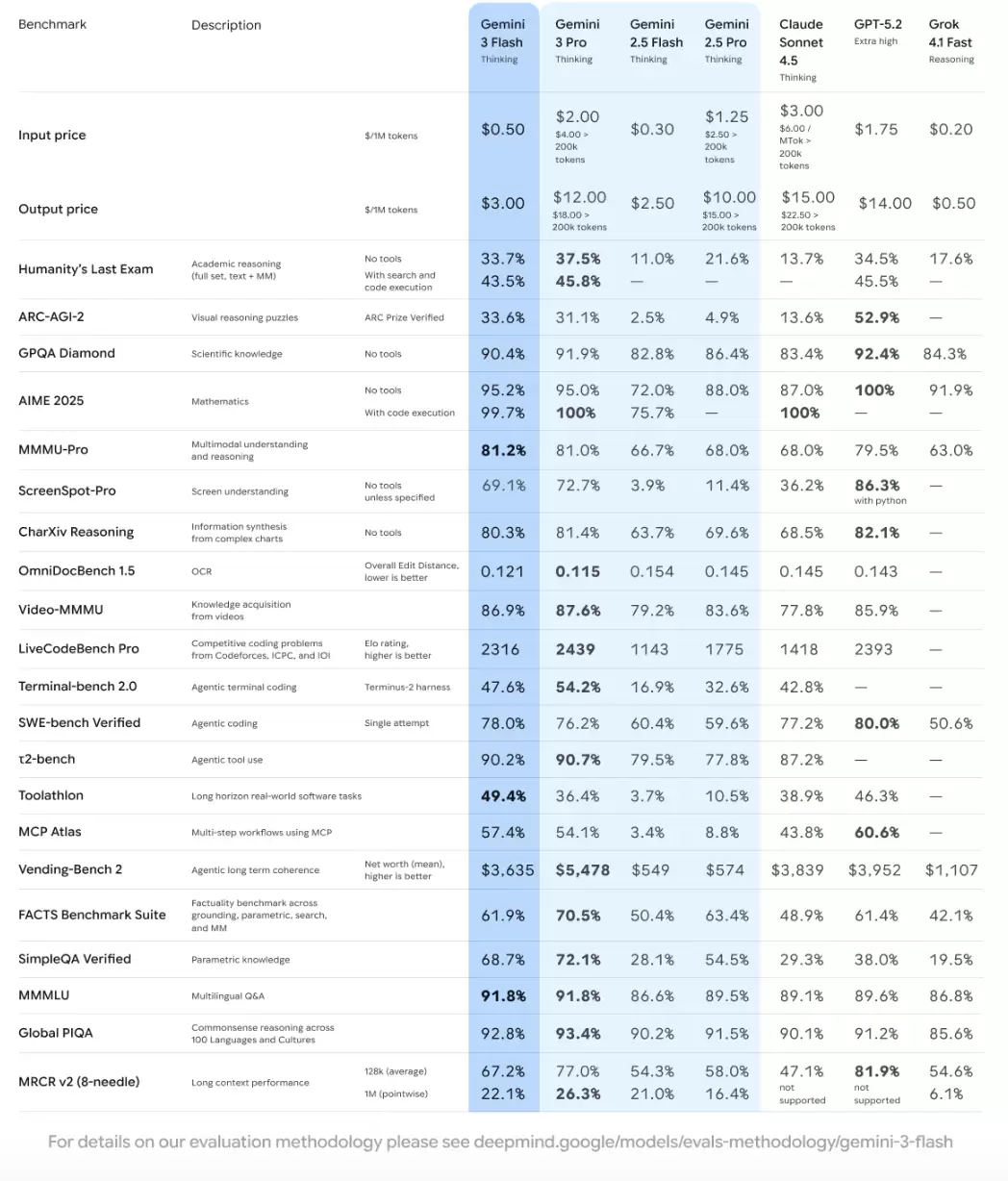 Gemini 3 Flash保留了Gemini 3 在复杂推理、多模态、智能体和编程任务方面的突破性性能,同时融合了 Flash 级别的延迟、效率和成本优势。“这是迄今为止在智能体工作流程方面表现最出色的模型。”谷歌如此评价。