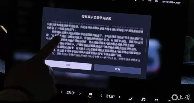 关闭功能前,一则“行车娱乐功能使用须知”会自动弹出,“为避免驾驶员在车辆行驶过程中因注意力分散导致安全隐患,我们已将系统默认设置为行车娱乐限制,您在确认知晓并完全同意如下全部条款的前提下方可手动关闭……但此时视频娱乐内容的服务对象应仅为乘客”,条款中提到了,“车辆行驶过程中,严禁驾驶员观看视频”等三条条款,阅读10秒后可点击同意按钮关闭行车娱乐限制。