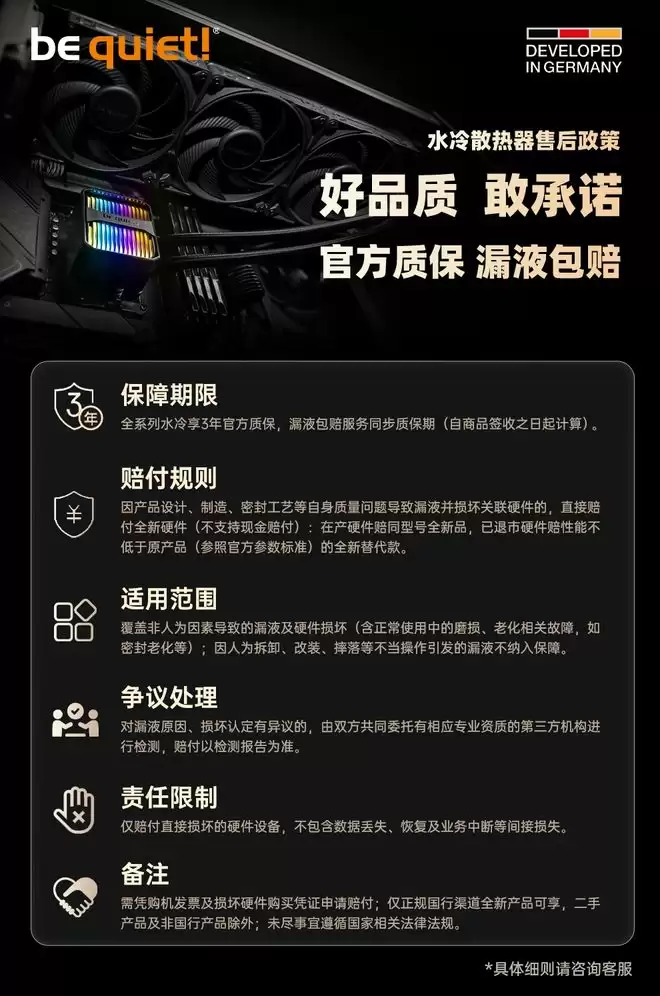 需要注意的是,be quiet! 此次推出的最新质保与漏液包赔服务仅适用于通过正规国行渠道购买的全新产品,不覆盖二手产品或非国行产品。