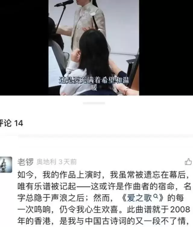 ### 老锣的“蹭热度”与孩子的站位 离婚半年后,老锣在龚琳娜《爱之歌》视频下留言“作曲R. L.”被网友骂上热搜。有人替他委屈,“作品署名也错?”但懂行的乐迷翻出原谱,发现老锣只写了三小节和声,主旋、歌词、编曲都是龚琳娜。