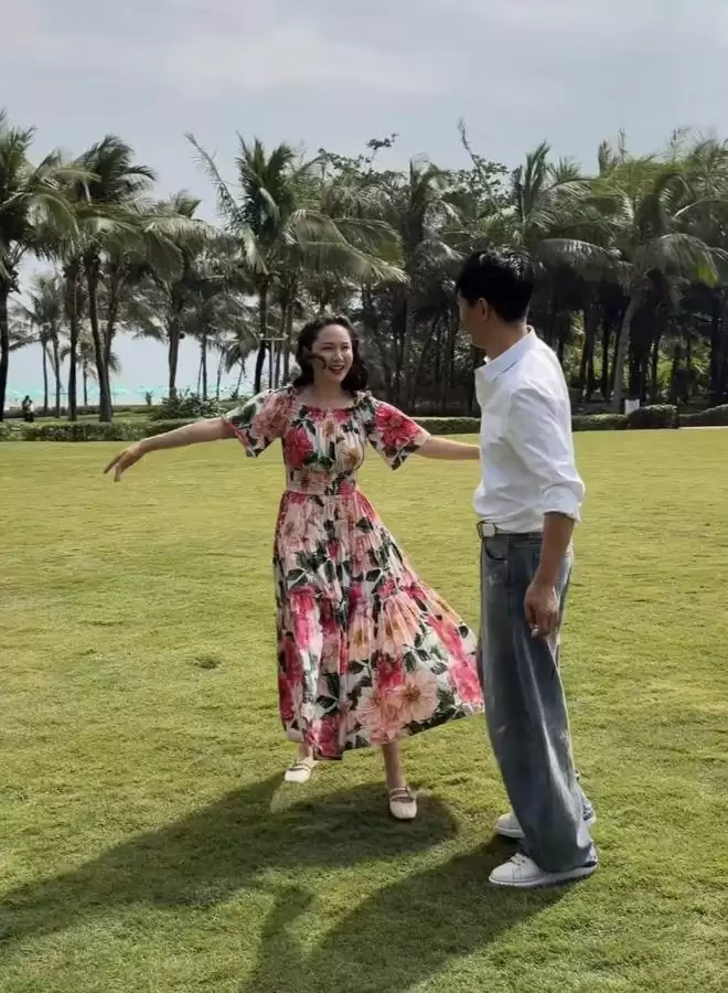 奔五的程莉莎,穿一件很有度假气息的浪漫花裙。以粉色系为主色调,展现出更甜美娇嫩的气质,48岁的她看着就像20多岁。
