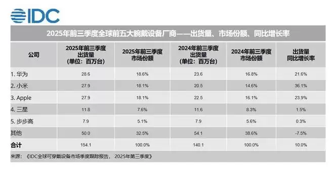 根据IDC的定义,腕戴设备主要包括智能手表与智能手环。报告中指出,2025年前三季度,全球智能手表出货量约为1.2亿台,同比增长7.3%。其中,中国市场的出货量为4004万台,同比增长21.8%。而在智能手环领域,全球前三季度出货量达到3286万台,同比增幅为21.3%;其中国市场出货量达1839万台,同比增长高达42.5%。