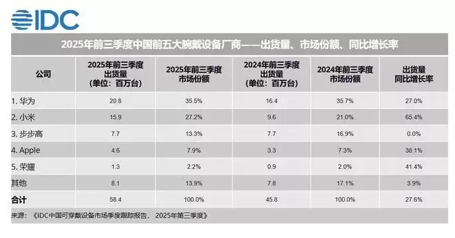 知名市场调研公司IDC近日发布了一份关于智能穿戴市场的分析报告,这份报告统计了2025年前三季度全球腕戴设备的整体表现。数据显示,今年前三季度全球腕戴设备总出货量达到1.5亿台,同比增长10%。其中,中国市场的表现尤为亮眼,累计出货量达5,843万台,同比大幅增长27.6%。