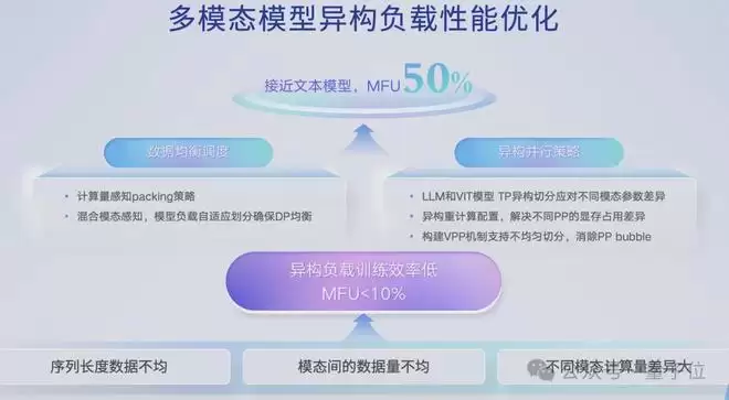 多模态模型则带来另一类问题,不同的模态会带来不同的训练强度,不同模态的计算,还用原来的同构拆分方法的话会导致训练的效率非常低,典型情况下MFU可能都不到10%。