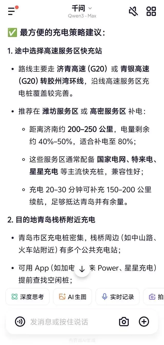 例如从济南泉城广场到青岛栈桥,电车续航400公里,千问推荐在潍坊服务区或高密服务区补电,距离济南约200–250公里,电量剩余约 40%–50%,适合补电至 80%;这些服务区通常配备国家电网、特来电、星星充电等主流快充桩,兼容性好;充电20–30分钟可补充150–200公里续航,足够抵达青岛并有余量。