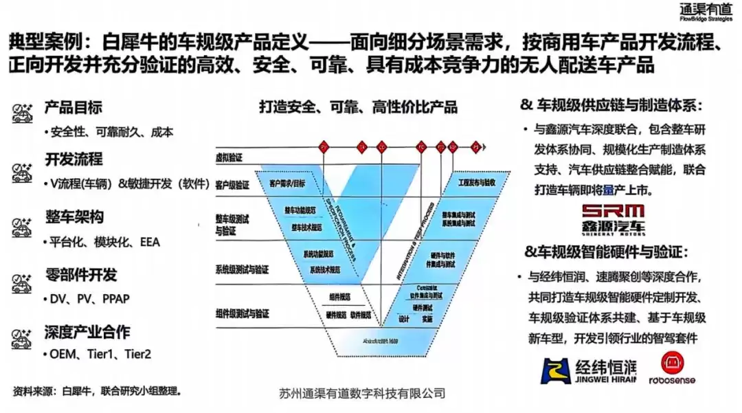白犀牛率先基于汽车V流程正向开发车规级无人车平台,携手主机厂鑫源汽车、经纬恒润等合作伙伴,共同打造真正符合车规级的L4无人物流产品及技术解决方案。该平台采用平台化、模块化设计,可快速适配物流、冷链、园区等多类场景需求。目前相关产品已进入上市倒计时。