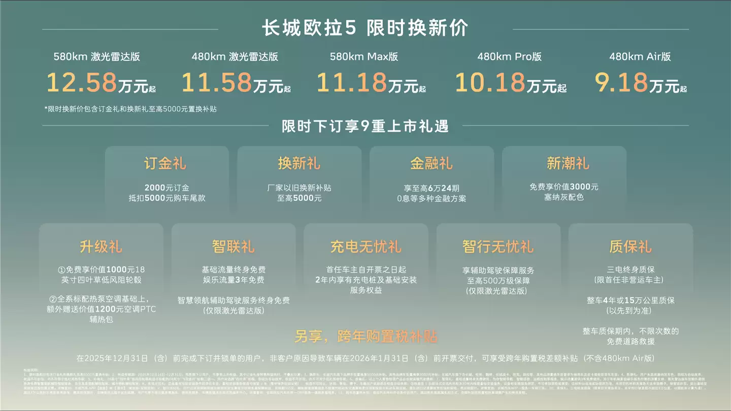 今天,长城汽车旗下欧拉品牌全新A级纯电SUV——长城欧拉5正式登陆市场。新车共推出5款不同配置,建议零售价区间为9.98万元至13.38万元,限时换新价9.18万元起(含“订金礼”与“换新礼”至高5000元以旧换新补贴)。即日起至2025年12月31日,用户下订并锁单即可享受包含订金礼、换新礼、智行无忧礼在内的9重上市好礼,以及跨年购置税补贴(不含480km+Air版)等购车权益。凭借极具竞争力的价格与越级产品力,长城欧拉5志在成为全球年轻用户的出行“严选搭子”。