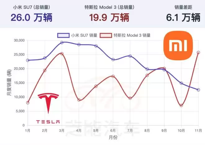 作为小米汽车的开山之作,SU7 在 2025 年交出了一份沉甸甸的答卷:累计销量突破 25 万台,稳居 20 万以上纯电轿车市场第一梯队,在大多数月份都压过特斯拉 Model 3 一头。