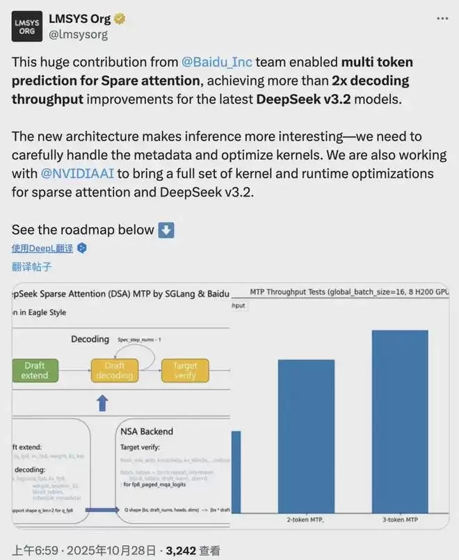 作为大模型时代崛起的重要开源项目之一的SGLang,百度智能云10月份携手SGLang社区,将一套针对DeepSeek-V3.2推理性能优化的 MTP(Multi-Token Prediction,多token预测)技术代码正式开源。SGLang 社区表示这是一项巨大的贡献,社区实测显示,采用这套技术,DeepSeek-V3.2模型解码吞吐量能提升超过2倍。